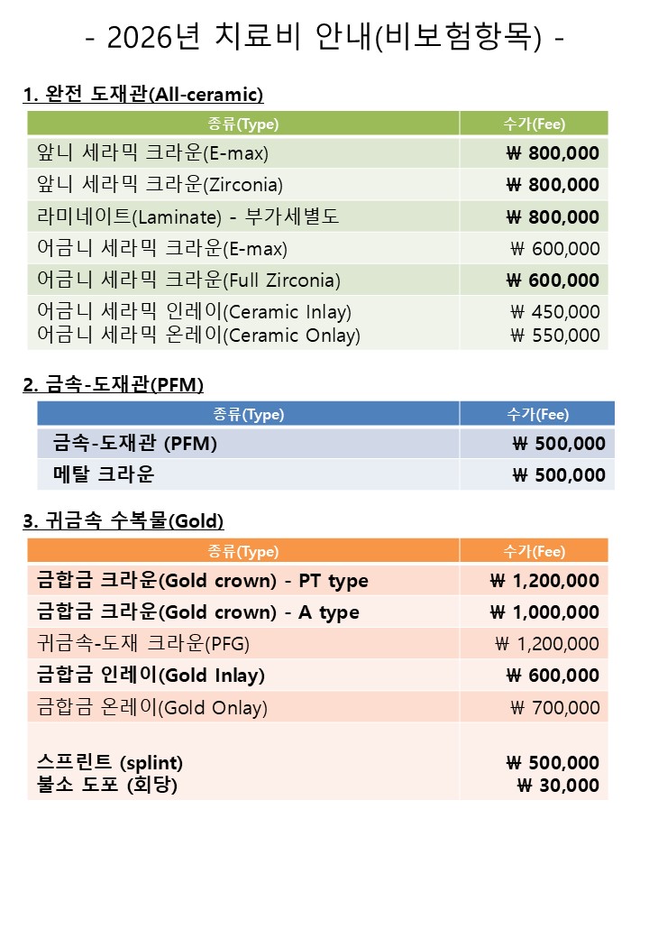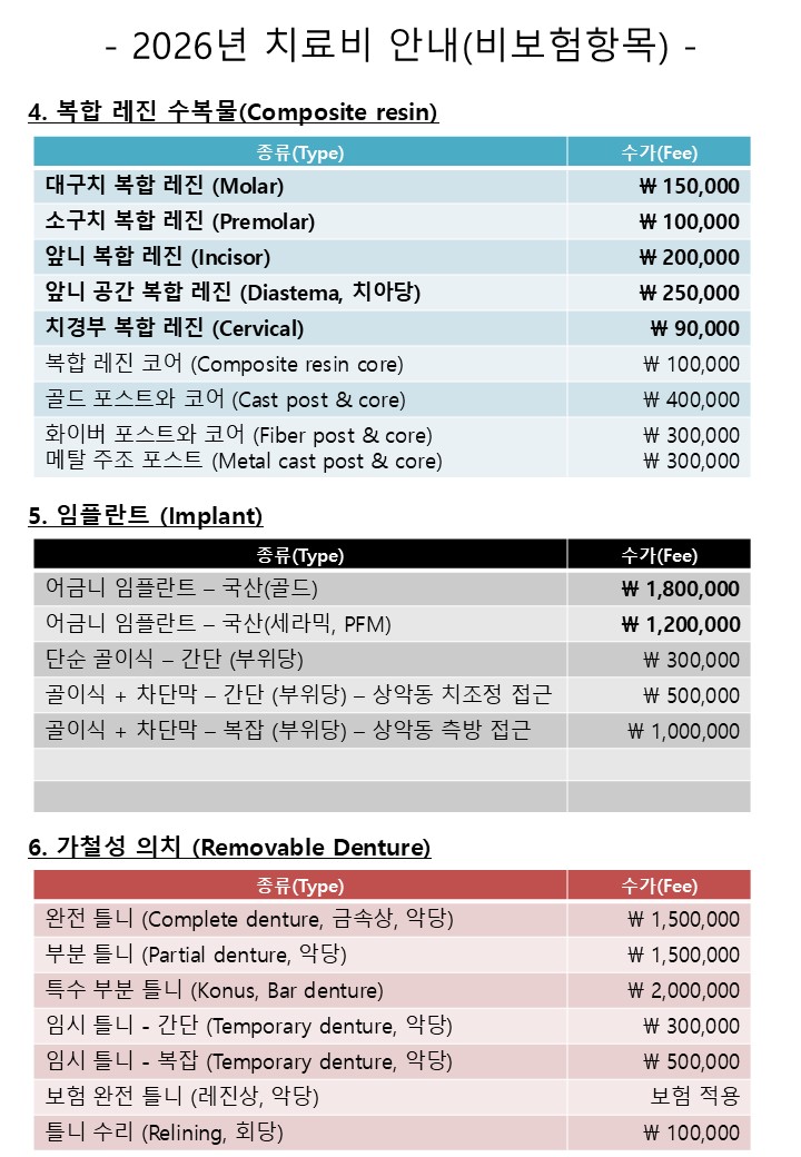 인쇄 스크랩 목록 공지 | 2026년 비보험 치료비 공지 페이지 정보 4월31일치과 37 0 2025-12-02 17:26:51 본문 2026년 비보험 치료비 입니다.2026년 1월 2일부터 적용됩니다. 인쇄 스크랩 목록 다음글 ▼온라인 예약 불가 댓글목록 등록된 댓글이 없습니다. 다음글 목록